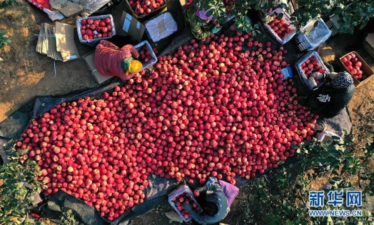 辽宁省锦州市义县张家堡镇土营子村果农在果园里将采摘的苹果装箱(11月4日摄,无人机照片)。新华社记者 姚剑锋 摄