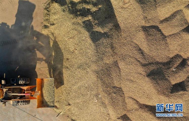 这是辽宁省锦州市义县张家堡镇官场沟村一家农业企业在进行花生晾晒加工(11月4日摄,无人机照片)。 新华社记者 姚剑锋 摄