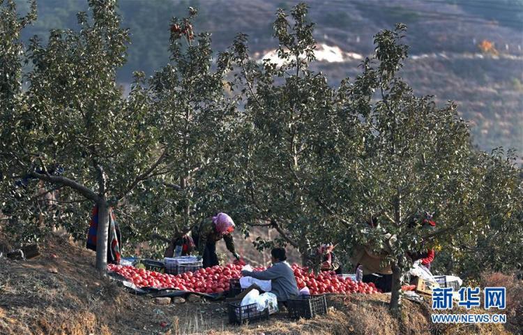 辽宁省锦州市义县张家堡镇土营子村果农在果园里将采摘的苹果装箱(11月4日摄)。 新华社记者 姚剑锋 摄