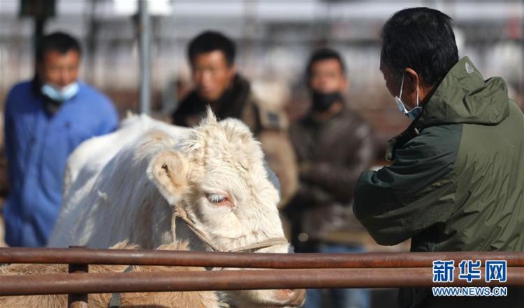 在辽宁省锦州市义县高台子镇桑土营子村的辽西活畜交易中心里,一名买家在观察自己中意的一头牛的身体状况(11月4日摄)。 新华社记者 姚剑锋 摄