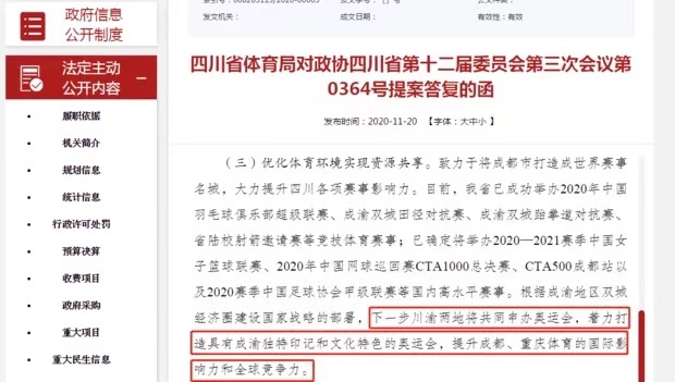 在从四川方面传出“川渝两地将共同申办奥运会”的消息引爆网络后,重庆市体育局“不知情”的回应着实让网友有些摸不着头脑。后续四川省体育局也表示,“(申奥)属于我们的工作规划和远景目标,目前正在与重庆积极对接、沟通、谋划之中。感谢社会各界对川渝体育事业协同发展的关注和支持!”