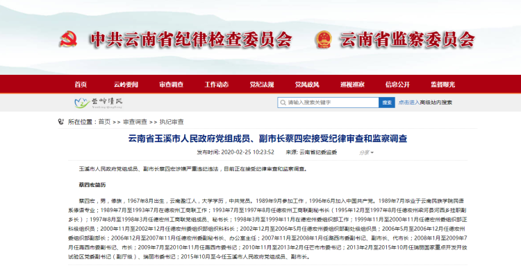 《玉溪市人民政府党组成员、副市长蔡四宏接受纪律审查和监察调查》