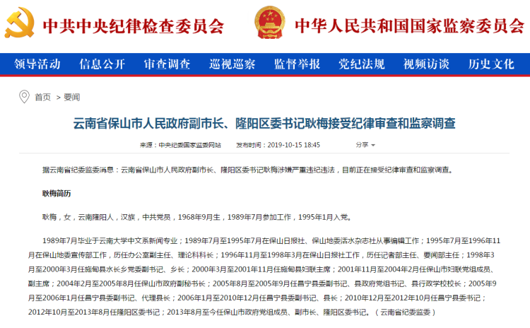 《保山市副市长、隆阳区委书记耿梅严重违纪被查》