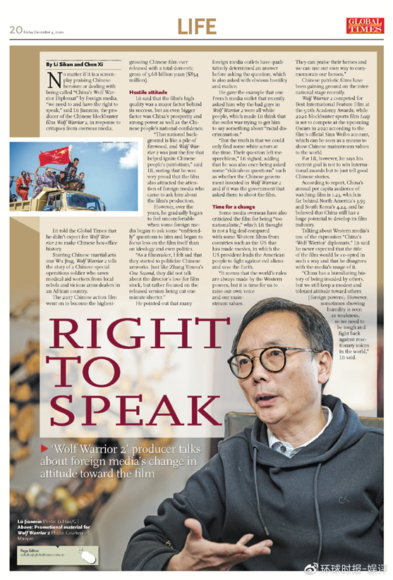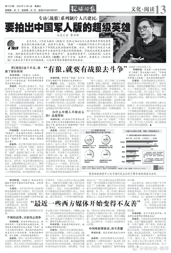 直至今天,3年前上映的《战狼2》依然以56.8亿元人民币稳坐中国电影票房总排行榜头把交椅。在很多人看来,“战狼”一词被赋予的含义早已超出电影本身,更象征着当下中国民众民族情绪的觉醒。近日,中国外交部发言人赵立坚在推特上转发澳军士兵在阿富汗暴行的讽刺插画,引起澳总理莫里森强烈不满,国外媒体再次将中国外交称为“战狼外交”。在这样的背景下,《环球时报》记者本周对《战狼》系列影片制片人吕建民(如图)进行了专访。采访中,吕建民与《环球时报》记者分享了影片创作的初衷,以及对军事战争题材电影的看法。