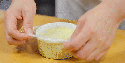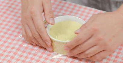 小碗表面盖上耐高温的保鲜膜,四周扎几个小孔方便透气。