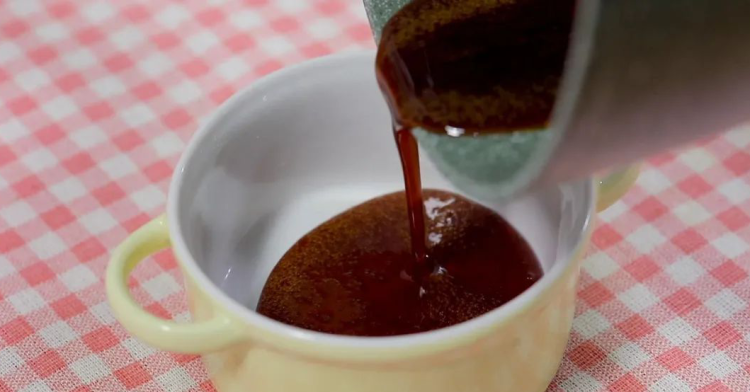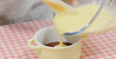 待焦糖凝固后,将搅好的糊糊倒入装有焦糖的小碗中,轻轻震平。