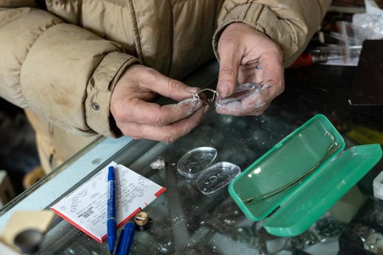 “今早有一副眼镜要做掉,客人马上要搬家了”,刘师傅头戴一顶灰色的画家帽,鼻梁上架着一副黑框眼镜,在一架镜片打磨仪前忙碌着。