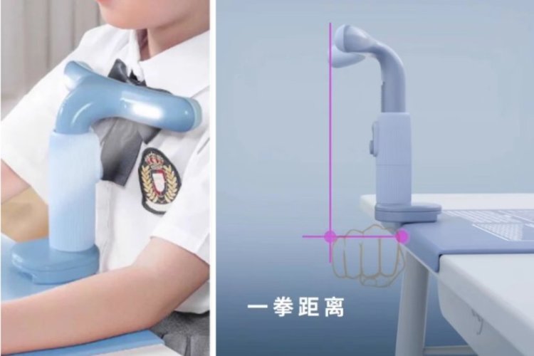 2. 通过顶住胸部的胸托来让孩子养成离桌一拳距离的坐姿习惯。