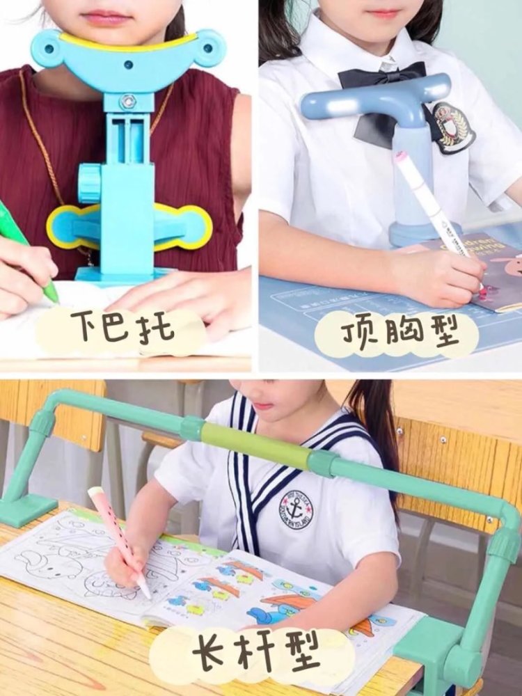 下巴托型就是类似下面这种,有一个用来托住下巴杠子的坐姿矫正器。不同牌子的造型可能各异,有比较简约的,还有做成这样卡通装的,但是核心都是有一个用来托住娃下巴的架子。