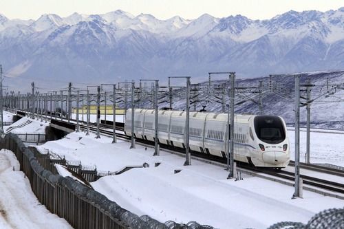 一列兰新高铁测试动车在海拔约3300米的祁连山麓疾驰。新华社发(蔡增乐 摄)