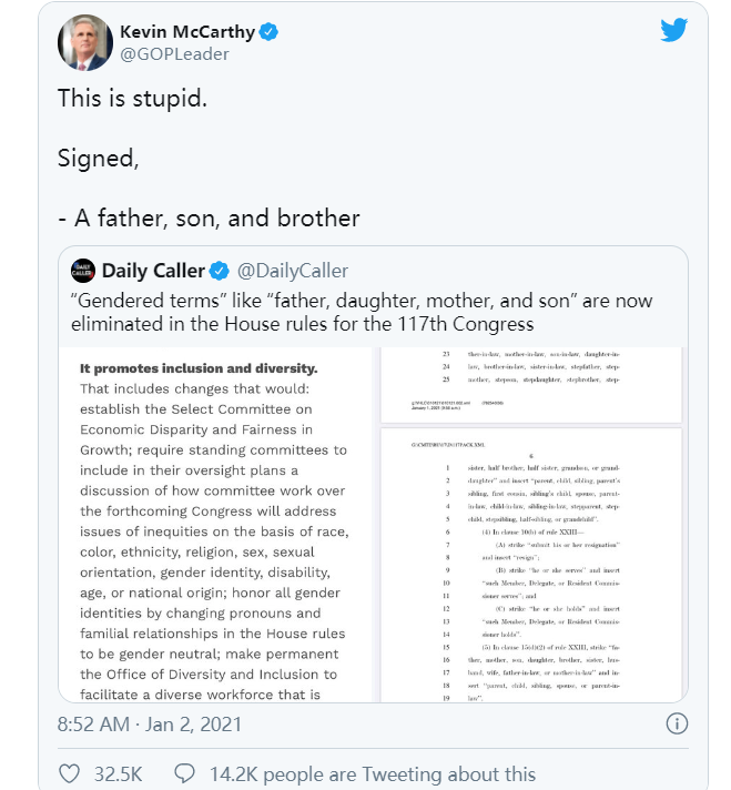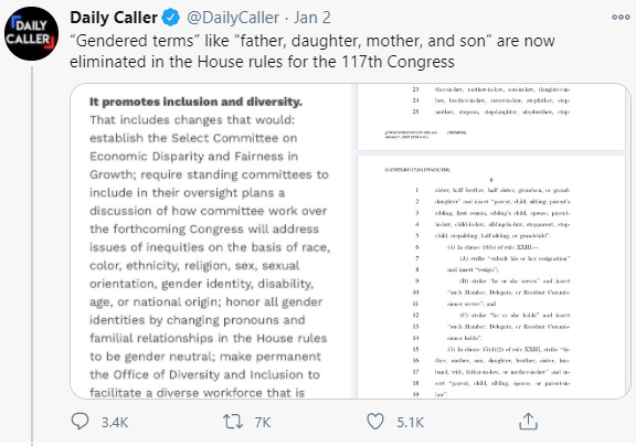 遗憾的是,2020年大选中重新赢回权力的美国民主党,似乎并没有吸取当年的教训。除了克里夫这个“awoman”的闹剧外,美国国会众议院的民主党籍议长南希·佩洛西,近日也抛出了一个极具争议的建议,想让众议院的规章制度文本中不再使用诸如“父亲、母亲、女儿、儿子”这种充满“性别色彩”的词语去描述家庭成员间的关系,而改用更加“性别中性”,以“包容”男性和女性之外的其他性别人群。