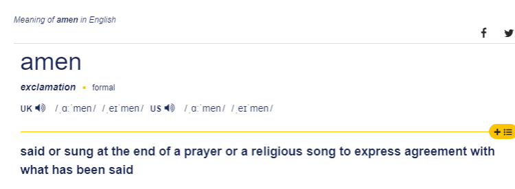就连英国剑桥大词典和美国韦氏大词典给出的关于“阿门”(amen)一词的解释也显示,这个词确实与男女没有任何关系,而是一种用在宗教祈祷之后的结束语,以表达对祈祷之词的认可之意。