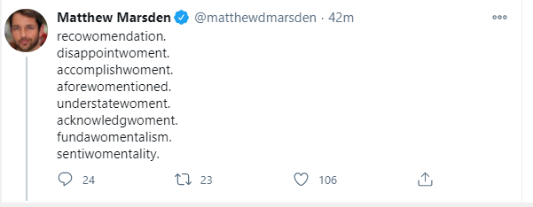 因此,此事目前已经遭到大量美国网民的调侃。比如有人就讽刺说,如果真要像克里夫那么“矫正”英文的话,那就干脆把英文中所有含有“men”这三个字母的单词都改为“women”得了,你们能看得懂就行: