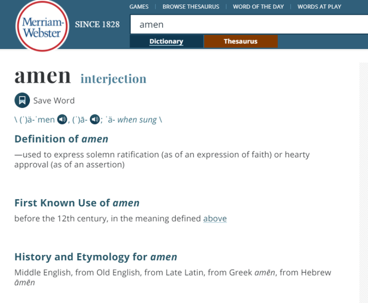 另外,韦氏大词典还显示,这个词的源头是希伯来语中的“āmēn”一词。