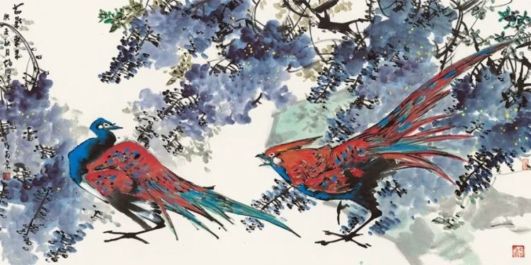 其一精神内涵的开拓。赵治平热爱生活,关注生命,创作思路继承了传统花鸟画“天人合一”,的观念,但又灌注了自己新的精神旨向。赵治平笔下的禽鸟,往往成双成对或成群结队,彼此依恋,浸透着人间的温情。