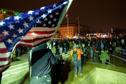 数以万计的示威者围堵在国会大厦附近,有人挥舞着美国国旗或自制旗帜,有人高喊口号。不少人装扮“抢眼”,还有人脸上涂抹着颜料。