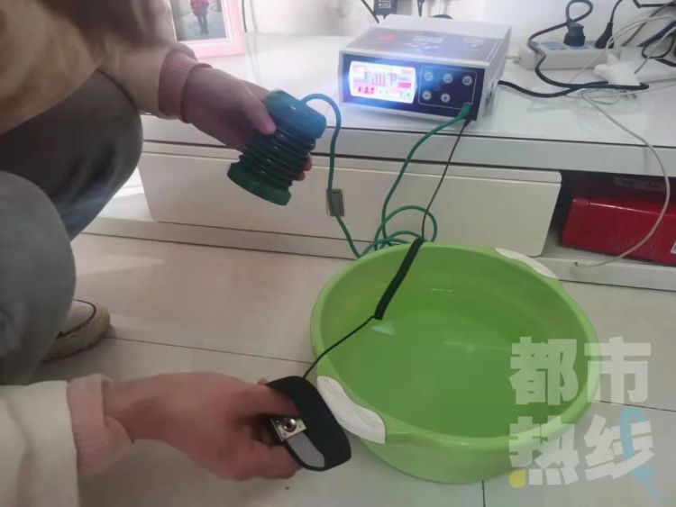 王女士:“把仪器离子头放在水里面,给水里头放些盐,把脚伸进去以后两个脚把它夹住,把腕带戴到手腕上面。”
