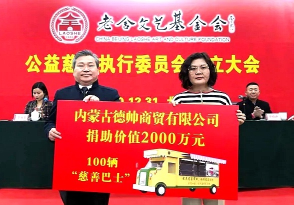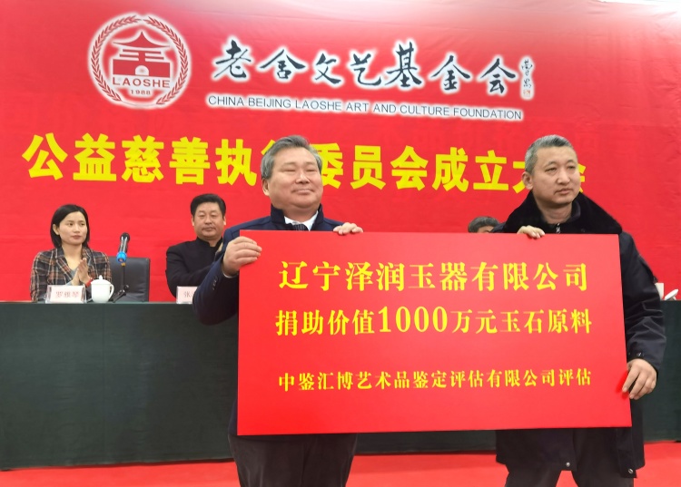 老舍文艺基金会公益慈善执行委员会成立大会上,还举办了现场捐助活动。辽宁泽润玉器有限公司向老舍文艺基金会捐助价值1000万元玉石原料,用于基金会与中华慈善总会天使慈善基金联合实施的技能培训学校教学;内蒙古德帅商贸有限公司向老舍文艺基金会捐助价值2000万元100辆“慈善巴士”,可安排500位弱势群体就业。内蒙古天善商贸有限公司董事长张春霞女士向老舍文艺基金会捐赠100万元,用于基金会公益慈善事业。两家单位捐助的实物,均由拥有国家级评估资质的中鉴汇博(北京)艺术品鉴定评估有限公司评估价值。