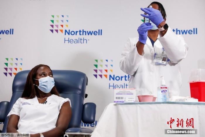 当地时间2021年1月4日,美国纽约,护士桑德拉·林赛在长岛犹太医院接种新冠病毒疫苗第二针。
