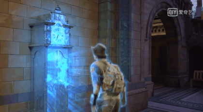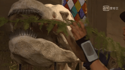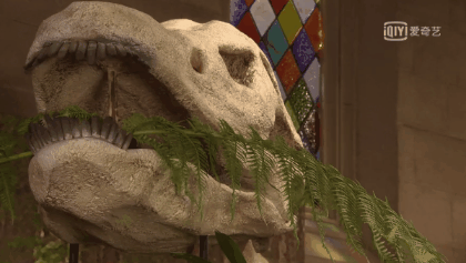 趁着展览前,安迪穿越回博物馆里,把新鲜的蕨类放回恐龙化石的嘴里: