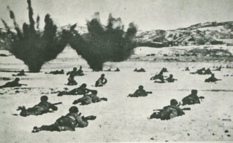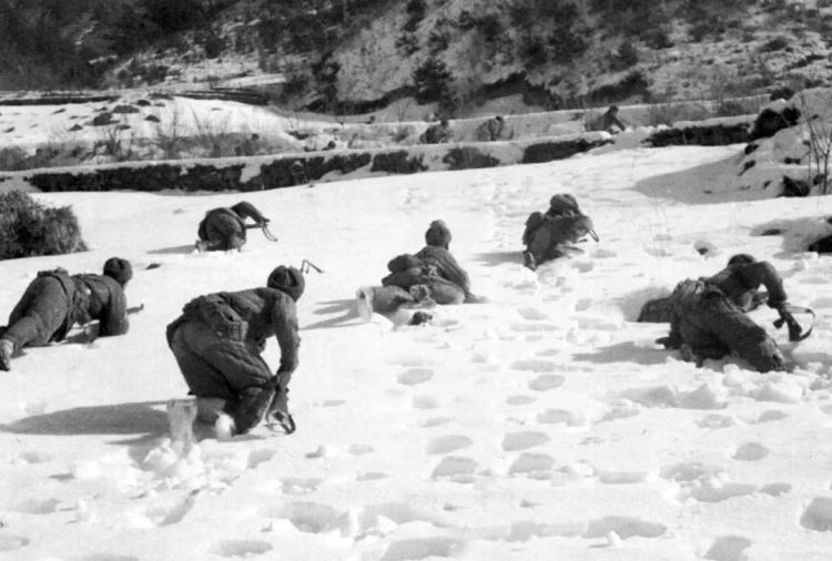 1950年11月27日,抗美援朝第二次战役发起。图为第二次战役中,连队官兵冒着严寒在雪地中向下碣隅里匍匐前进。