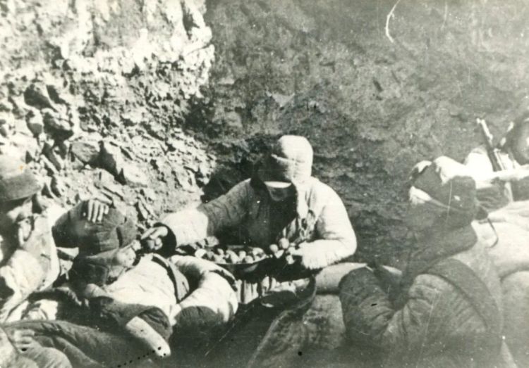 战场环境异常恶劣,战士们吃不上热食,以冻成冰块的土豆充饥。