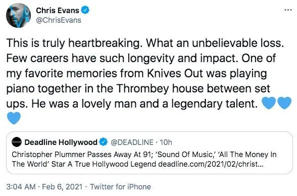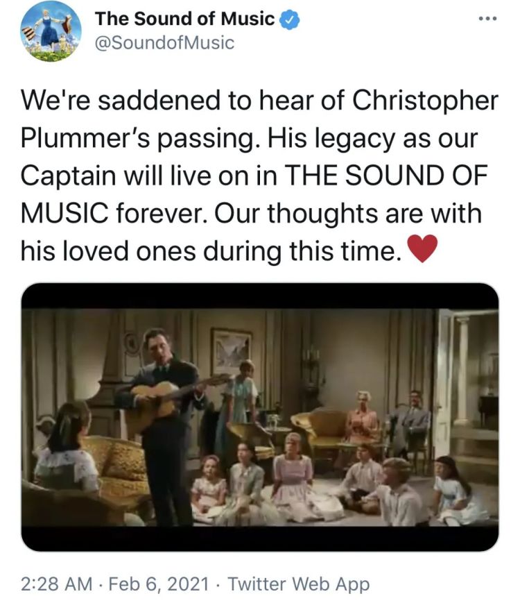 《音乐之声》中的“冯・特拉普上校”、好莱坞传奇男星克里斯托弗·普卢默(Christopher Plummer)于当地时间2月5日在其美国康涅狄格州的家中去世,终年91岁。