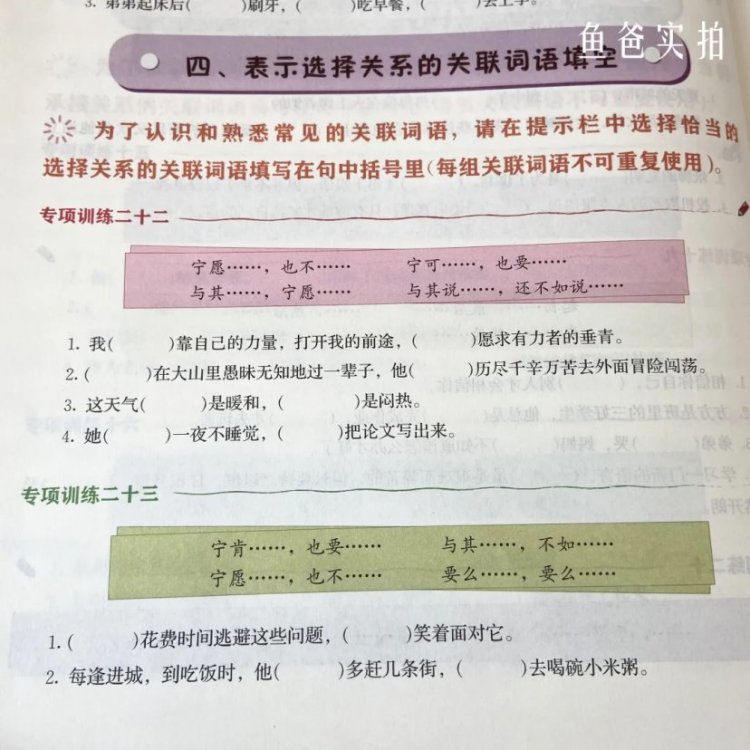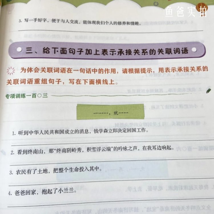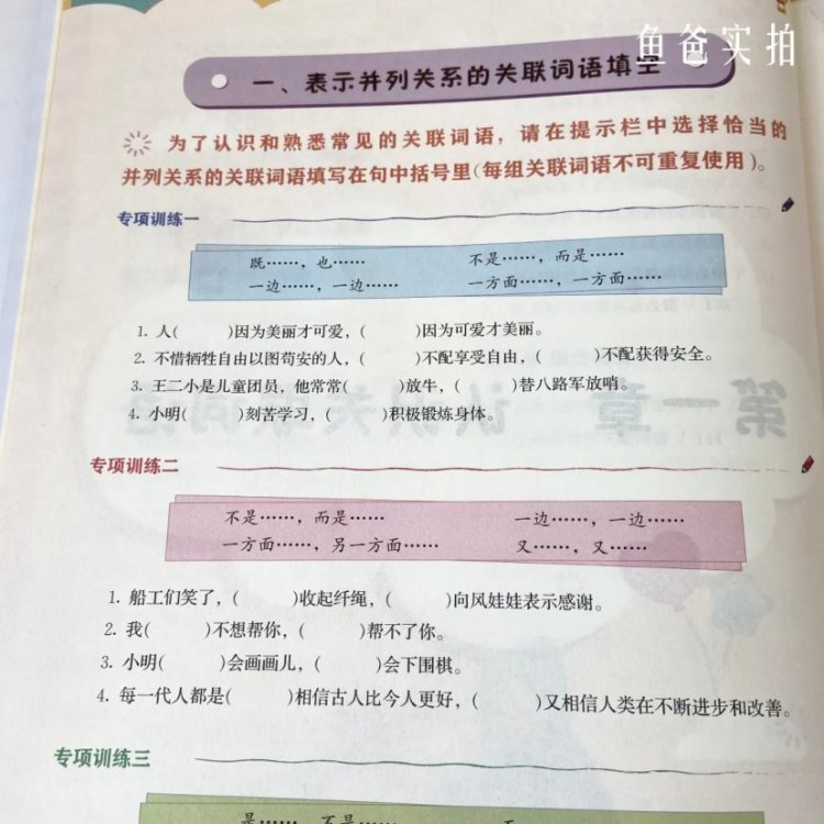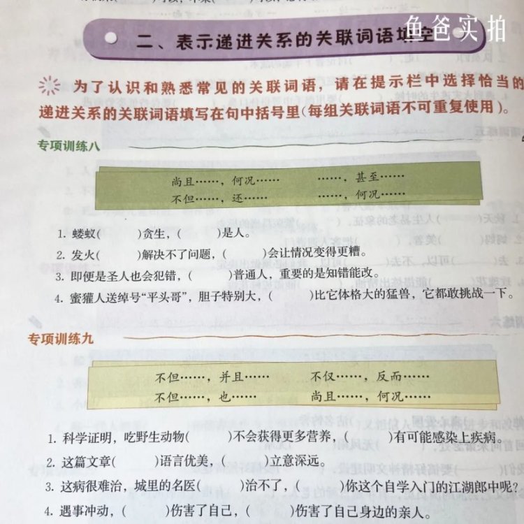 比如关联词训练大全一一列出,从并列、递进、承接、选择关系的关联词进行专项训练,加深孩子的理解和记忆,帮助他们轻松用好关联词。
