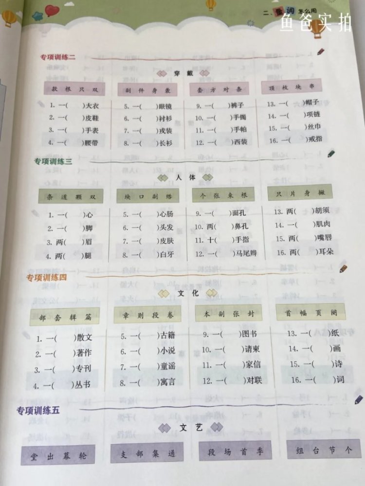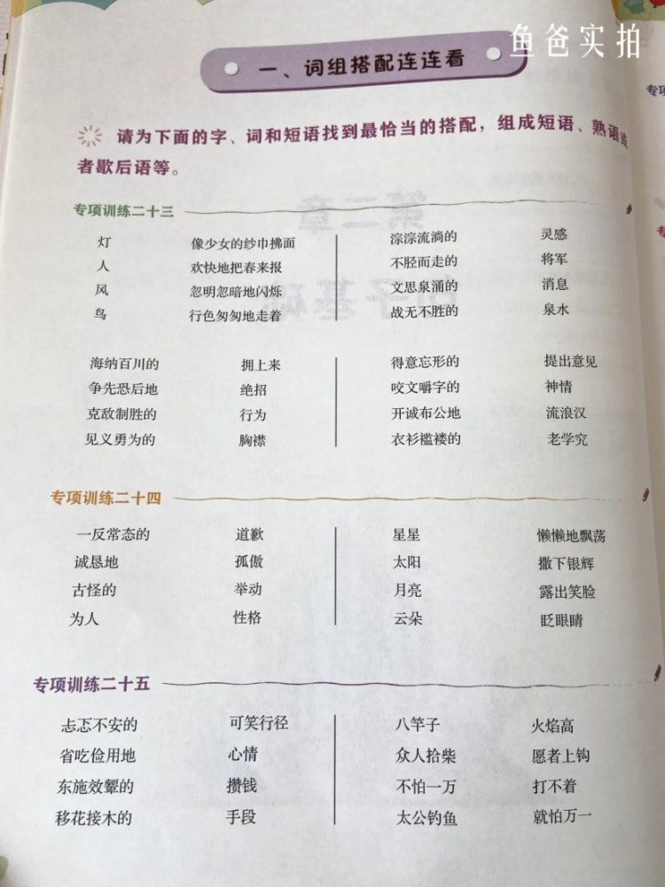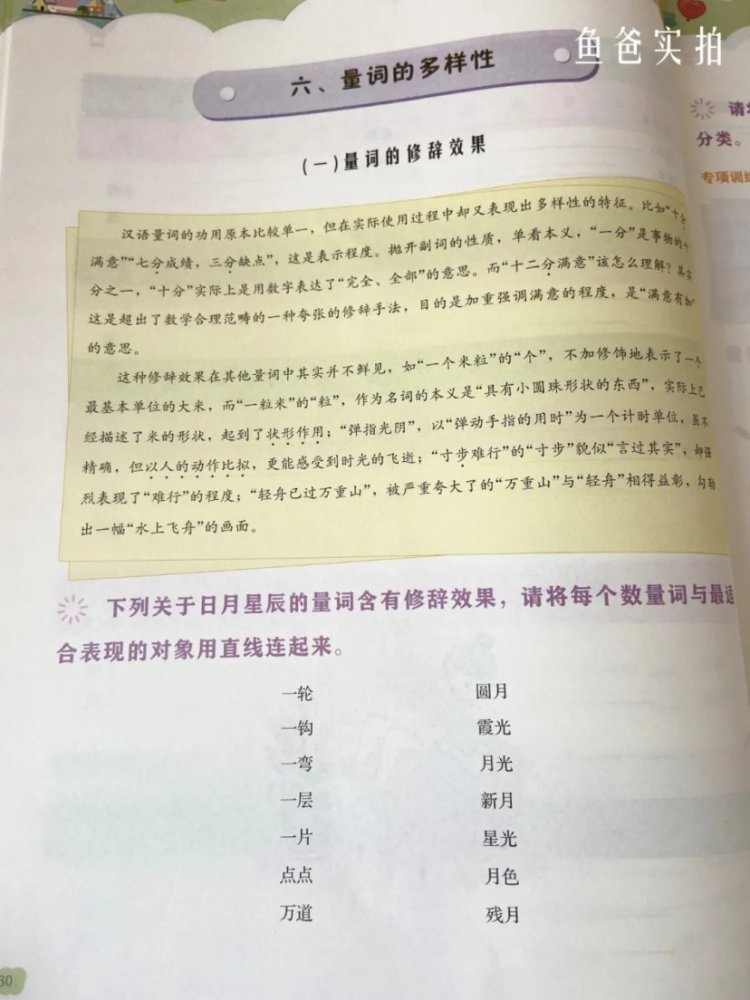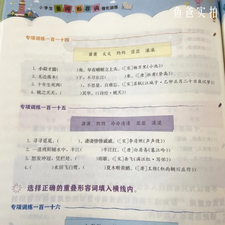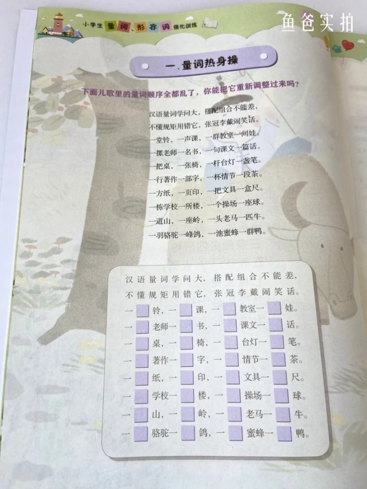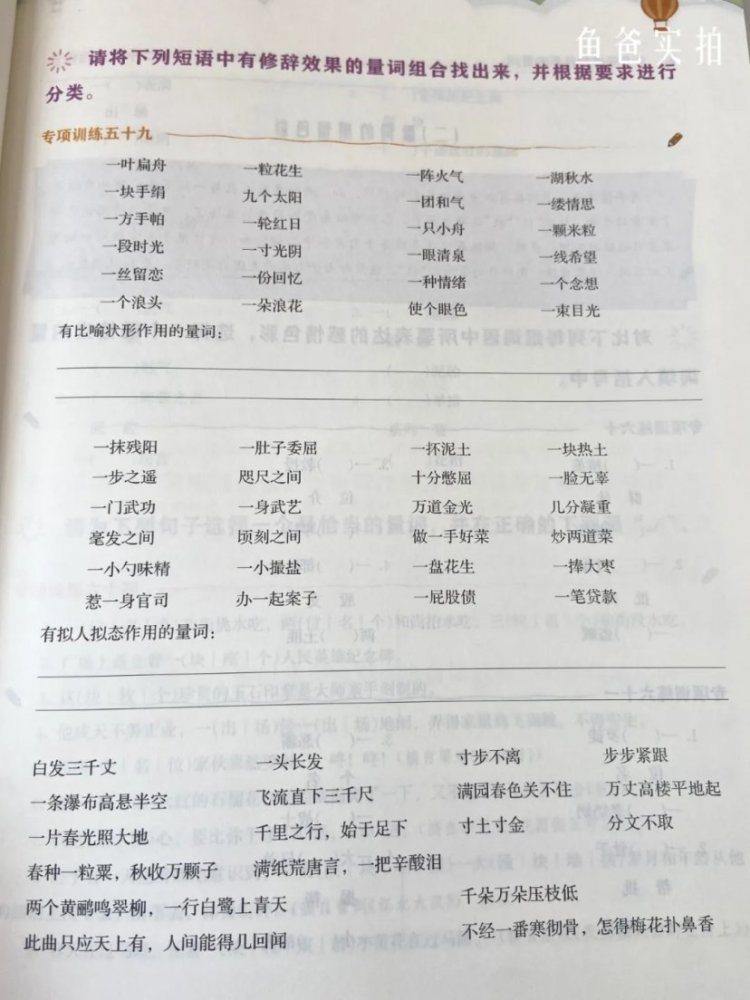 从上面这种实拍图可以看到,虽然是量词的练习,但是摘抄的句子都是名篇里的。读起来就是一种熏陶。