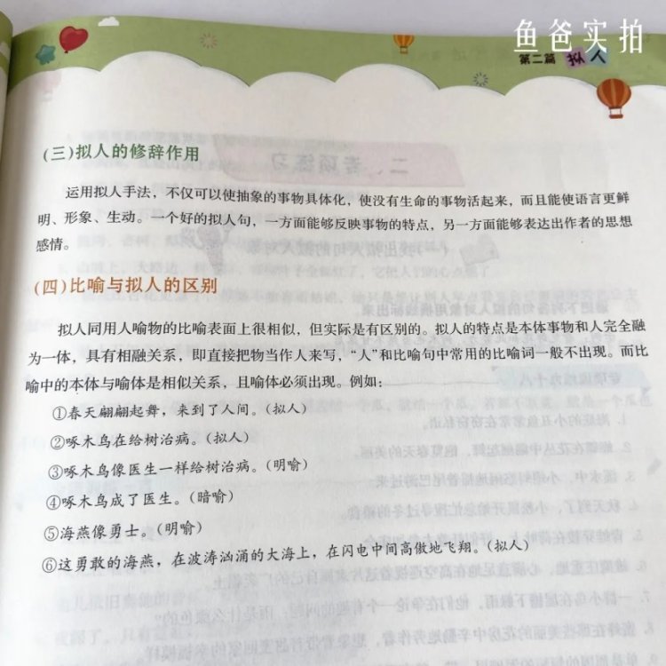 如比喻和拟人之间的区别,通过简明扼要的6个句子举例就能学会,这样孩子能够区分不会用错,在造句和写作上面很有帮助。