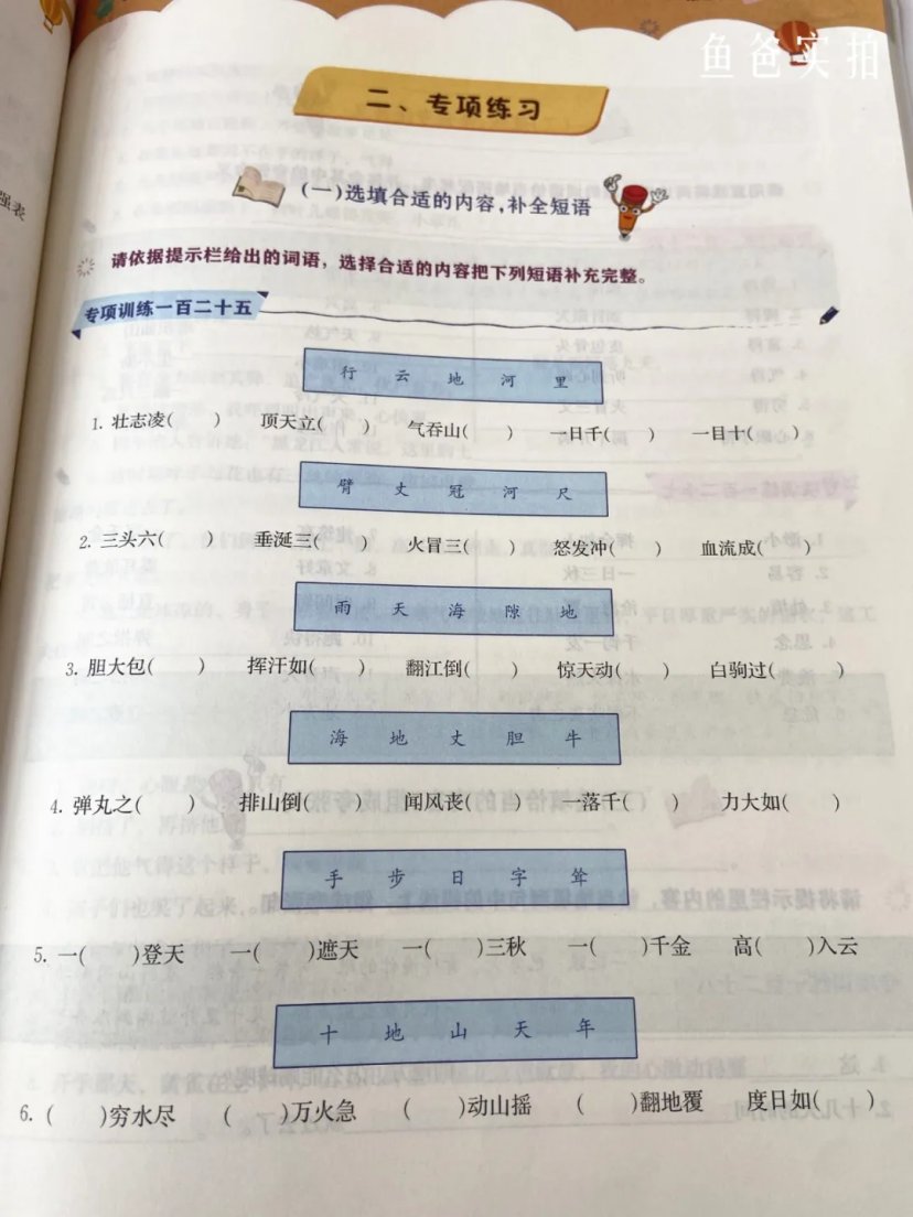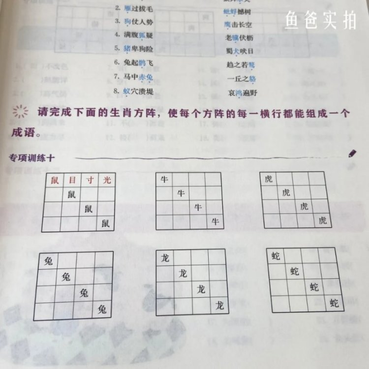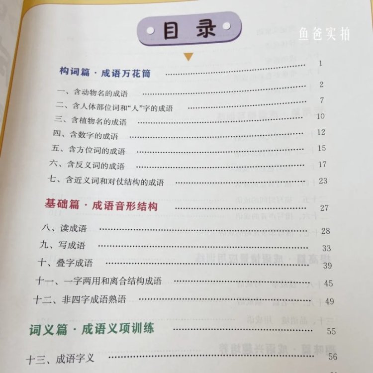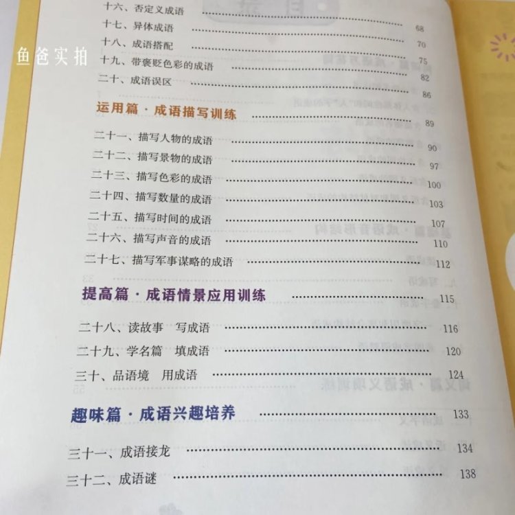 这本首先从构词开始让孩子明白成语的意义;其次到基础的成语音形结构‘过渡到进阶段位的词义篇让孩子“知其然知其所以然”;拥有一定基础后再延伸到成语义项训练的运用篇——成语描写训练。
