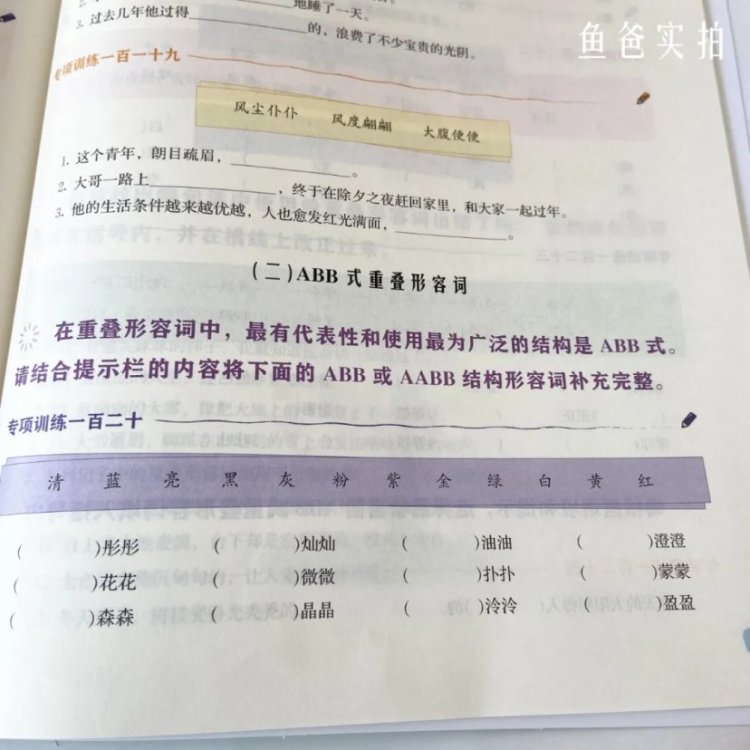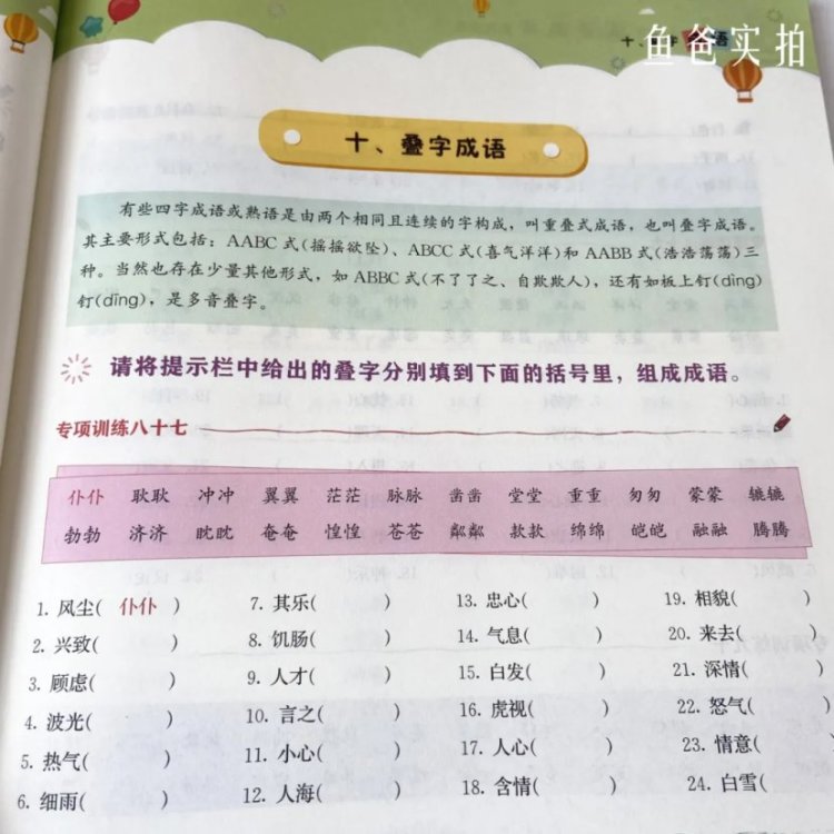 别急,关于叠词,他们也会出现在成语中。在另外一册《成语熟语》强化训练中又发现了它们。