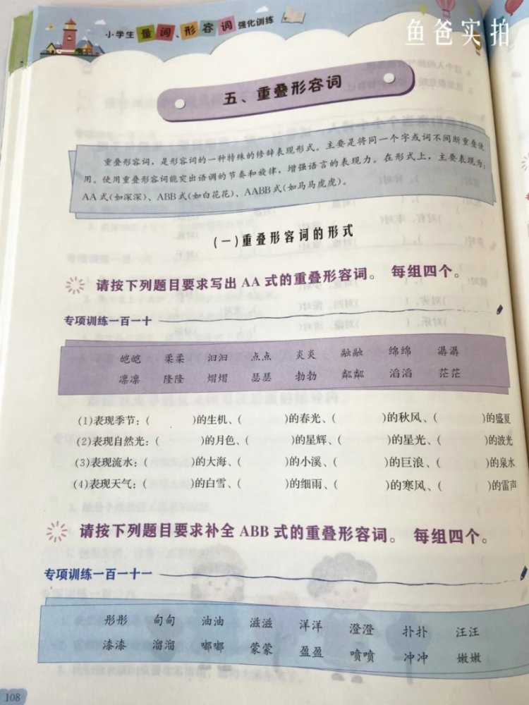 重叠形容词细分了好几类, 孩子们可以从练习中去记忆去积累,对词语和句子的理解能力也能增加孩子的阅读理解能力。