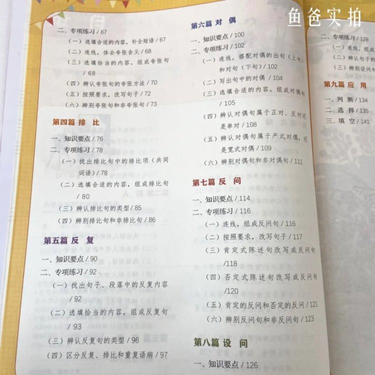 比如“修辞手法”这一册,分成了九个篇章,分类讲解修辞手法的类型,小学阶段常见的修辞手法有很多,如书里讲的:比喻、拟人夸张、排比、反复、对偶、反问、设问。