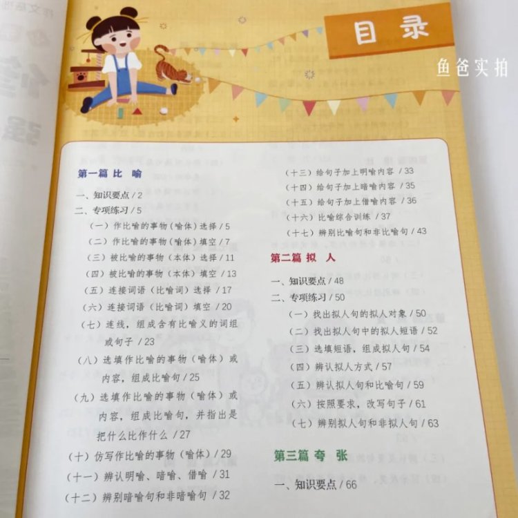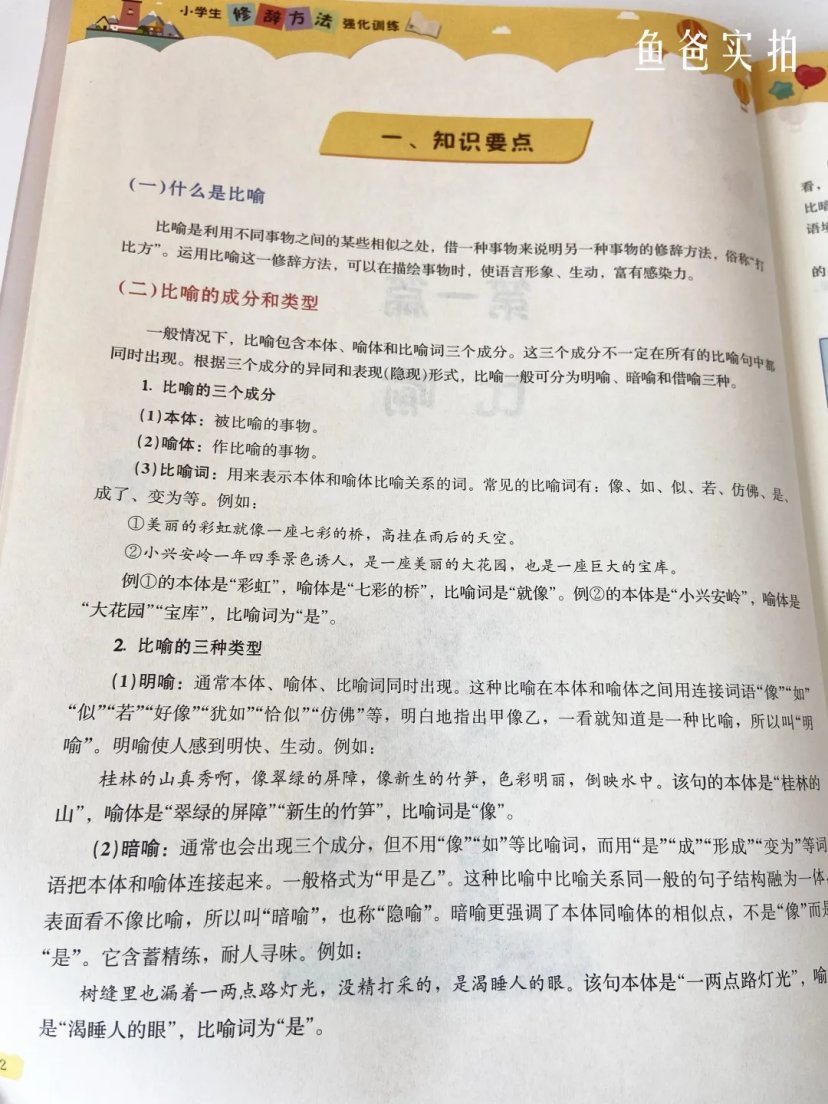 里面讲了小学阶段,语文需要掌握的基本的比喻、拟人、夸张、排比、对偶、反复、设问、反问等修辞方法,详细的给孩子讲解。