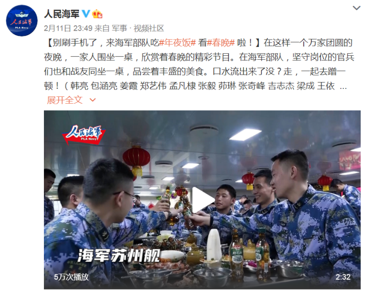 今年2月11日除夕当晚,中国人民解放军海军官方微博“人民海军”发布一则视频新闻,开头就是海军苏州舰官兵吃年夜饭庆祝春节的画面。