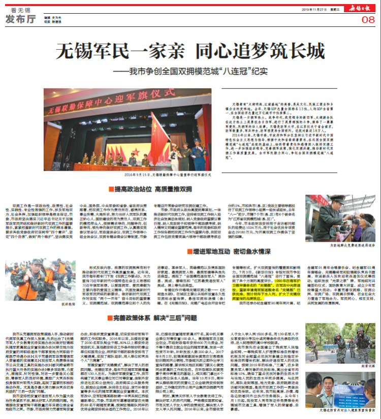 “江苏籍”舰艇的命名和互动的一系列过程,是江苏人民对双拥工作高度重视、热情支持的缩影。去年10月发布的全国双拥模范城中,江苏省18个城市获授全国双拥模范城(县)称号,12个设区市在列,且不少城市是连年获表彰,如常州是“七连冠”、无锡是“八连冠”、南京是“九连冠”。另外这一年,江苏的江阴市、宜兴市、新沂市、张家港市、常熟市、太仓市也同时获评双拥模范城。除新沂外,其他地名全部命名过海军舰艇。