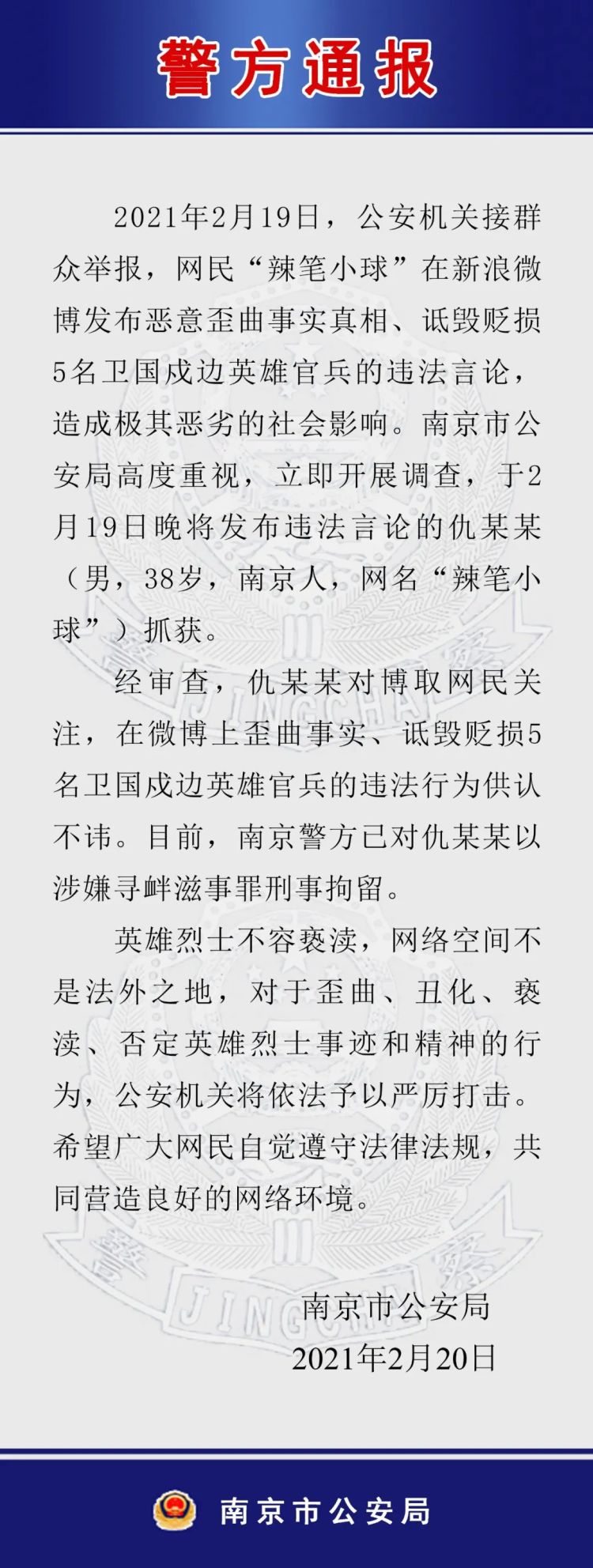 2月19日,公安机关接群众举报,网民“辣笔小球”在新浪微博发布恶意歪曲事实真相、诋毁贬损5名卫国戍边英雄官兵的违法言论,造成极其恶劣的社会影响。南京市公安局高度重视,立即开展调查,于2月19日晚将发布违法言论的仇某某(男,38岁,南京人,网名“辣笔小球”) 抓获 。