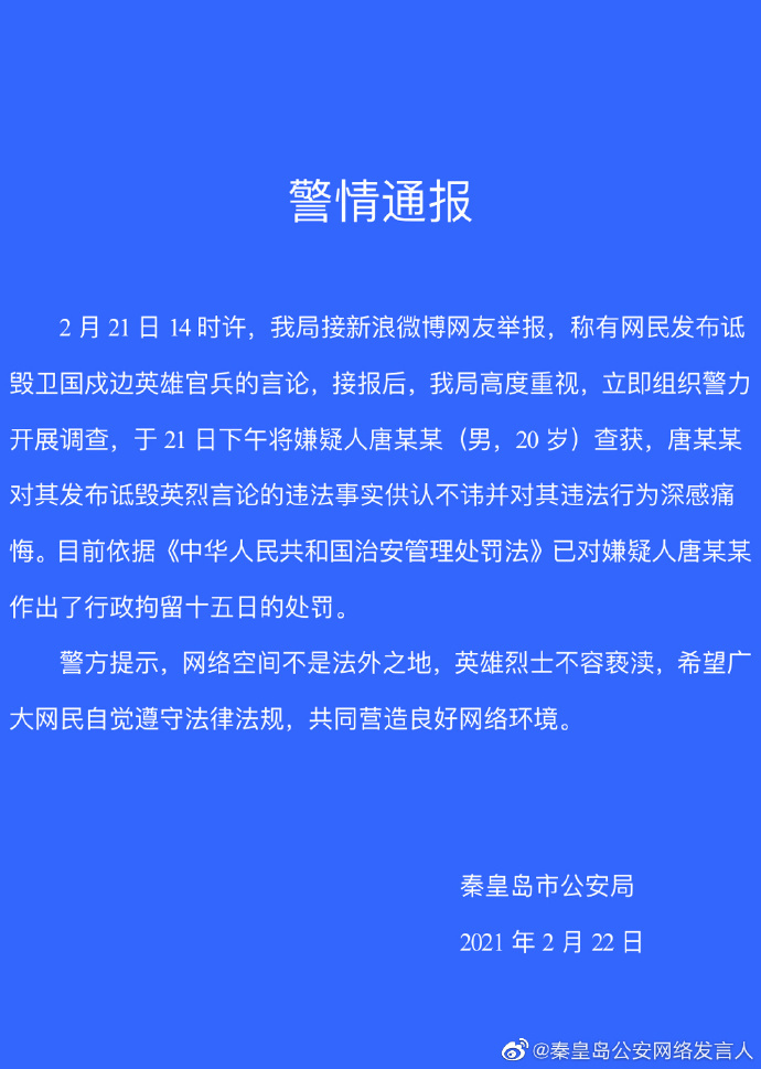 2月21日14时许,我局接新浪微博网友举报,称有网民发布诋毁卫国戍边英雄官兵的言论,接报后,我局高度重视,立即组织警力开展调查,于21日下午将嫌疑人唐某某(男,20岁)查获,唐某某对其发布诋毁英烈言论的违法事实供认不讳并对其违法行为深感痛悔。目前依据《中华人民共和国治安管理处罚法》已对嫌疑人唐某某作出了行政拘留十五日的处罚。