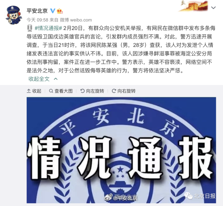 2月20日,有群众向公安机关举报,有网民在微信群中发布多条侮辱诋毁卫国戍边英雄官兵的言论,引发群内成员强烈不满。对此,警方迅速开展调查,于当日21时许,将该网民陈某强(男,28岁) 查获,该人对为发泄个人情绪发表违法言论的事实供认不讳。目前,该人因涉嫌寻衅滋事罪被海淀公安分局依法刑事拘留,案件正在进一步工作中。