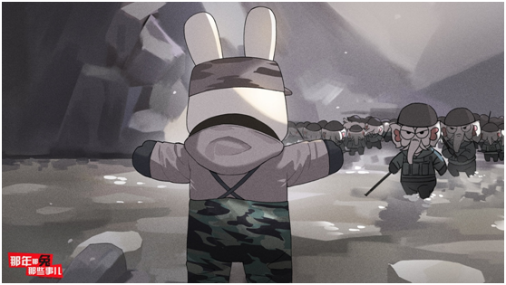 事实上,林超及其团队“翼下之风科技动漫有限公司”20日就已经基于媒体公布的边境冲突细节创作了一副同人漫画。画中,英雄团长祁发宝张开双臂,阻挡涉水而来的印军的情景被塑造成了《那兔》系列中的经典兔子形象,而印军则以“大象”的形象展现。
