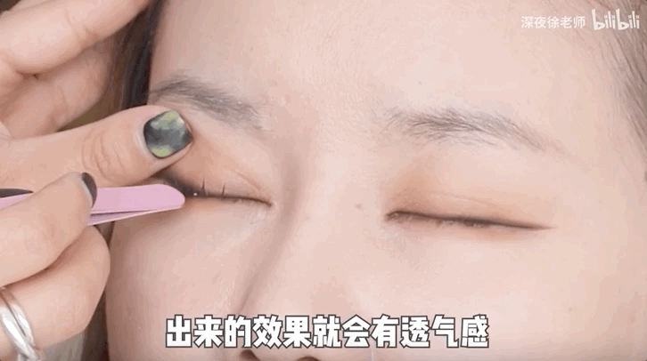 大概确定好眼妆形状后我们贴上上假睫毛,杨单老师选择的是一簇一簇地夹睫毛,混合了两组来贴以此达到更自然透气的感觉,大家也可以参考。