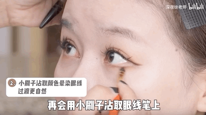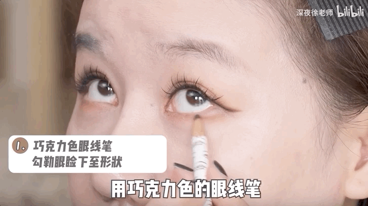 先用巧克力色眼线笔再次贴着画好的眼下影边缘勾勒形状,再用刷子蘸取眼线笔颜色晕染过渡。