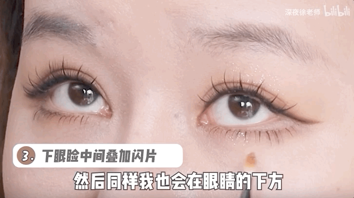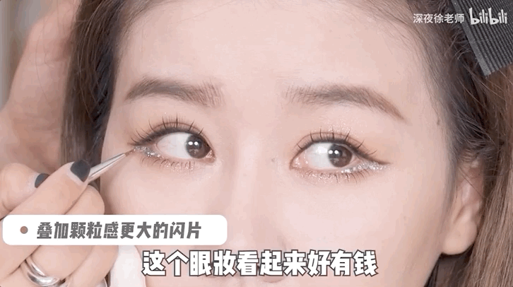 最后,我们用亮片液体眼影涂在留白处再叠加上欣欣子同款的大闪片就OK啦~(如果想要自然妆效,记得免除这一步。)