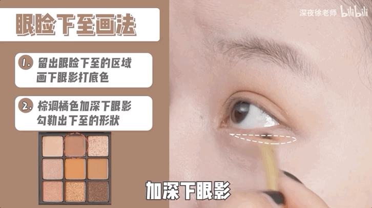 用细节刷蘸取打底哑光色,从下眼尾后半段开始平拉出去,再用橘色眼影勾勒加深,画出眼睑下至的效果。