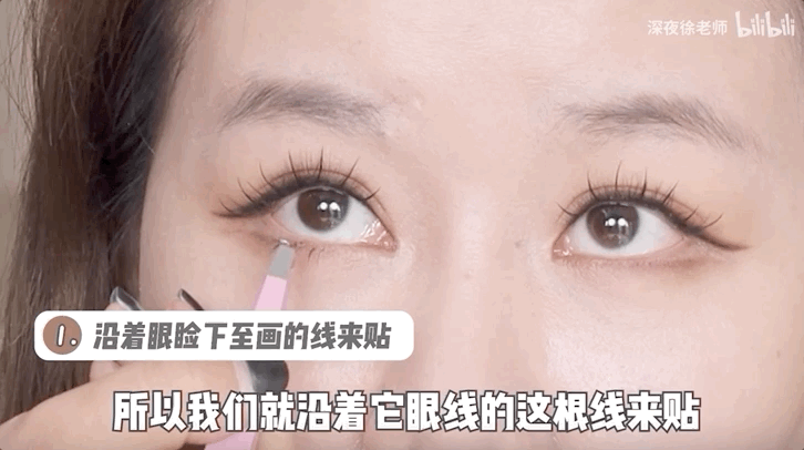 接着,沿着画好的眼睑下至的边缘贴好至关重要的下假睫毛,营造出睫毛天生长在那里的假象。