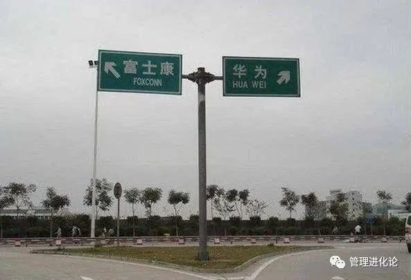 驱车从深圳梅林关到梅观高速,远远就能看见这个指路牌:富士康向左,华为向右。