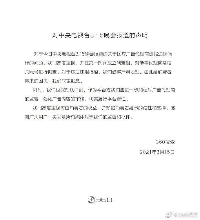 360搜索官方微博就3·15晚会报道的360搜索医药广告造假链条问题发表了声明:对涉事代理商及相关账号进行彻查。对违法违规行径,必将严肃处理,给消费者带来的困扰深表歉意。同时,作为平台方,360搜索应进一步加强对广告代理商的监管,强化广告内容的审核,切实履行平台责任。