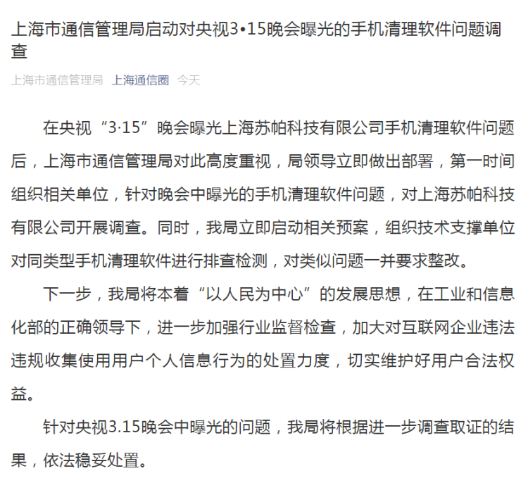 3·15晚会提醒老人慎用手机清理类软件 上海通信管理局已开展调查!