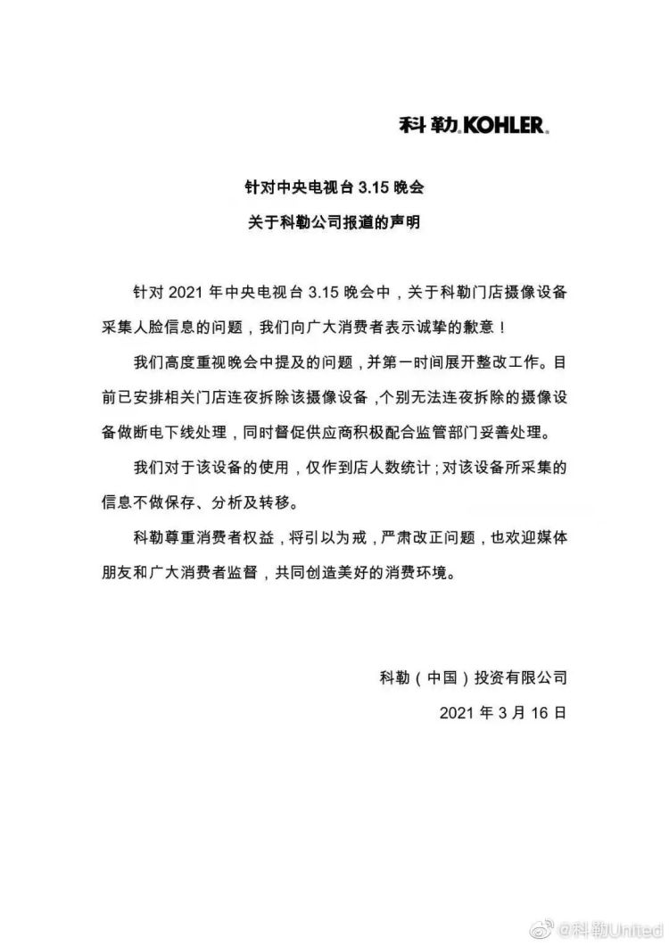 在3•15晚会报道多家知名商店安装人脸识别摄像头的问题后,科勒回应:我们向广大消费者表示诚挚的歉意!我们高度重视晚会中提及的问题,并第一时间展开整改工作。目前已安排相关门店连夜拆除该摄像设备,个别无法连夜拆除的摄像设备做断电下线处理,同时督促供应商积极配合监管部门妥善处理。我们对于该设备的使用, 仅作到店人数统计;对该设备所采集的信息不做保存、分析及转移。